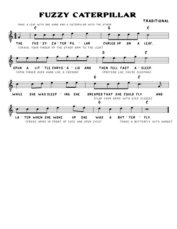 Example: “Hi everyone! Today we’re going to learn Fuzzy Caterpillar. We’ll start with the hand movements first.”